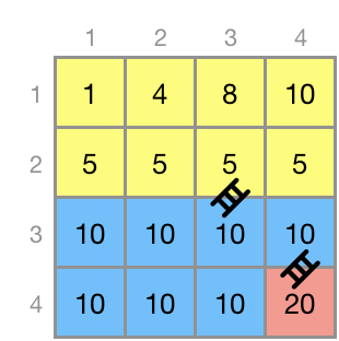 | [[1, 4, 8, 10], [5, 5, 5, 5], [10, 10, 10, 10], [10, 10, 10, 20]] | 3 | 15 |