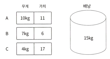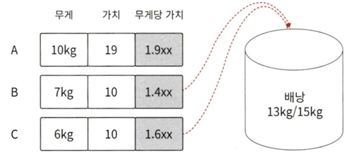 위와 같은 문제로 예를 들면, 무게당 가치가 높은 짐부터 넣을 시 A를 먼저 10kg 넣게 된다. 가용 용량은 5kg이 남고, 배낭에 넣은 짐의 가치는 19이다.